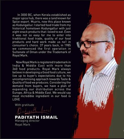 Now Royal Mark is registered trademark in India & Middle East with more than 360 food products. Our Wide Range of food products includes, Snacks, Spices, Spices Mix, Pickles, Jam, Sauce, squash, Convenience food, Oils, Rice, Rice Powders, Double old Jeerakasala Rice, Etc. Our Demanding chefs and Product Developers are driven by Innovation & Professionalism. Every single ingredients is cautiously selected and measured, One tiny gram can make a huge difference. Our professional tasters taste each batch of the product, before it's been dispatched to consumer's dining table.